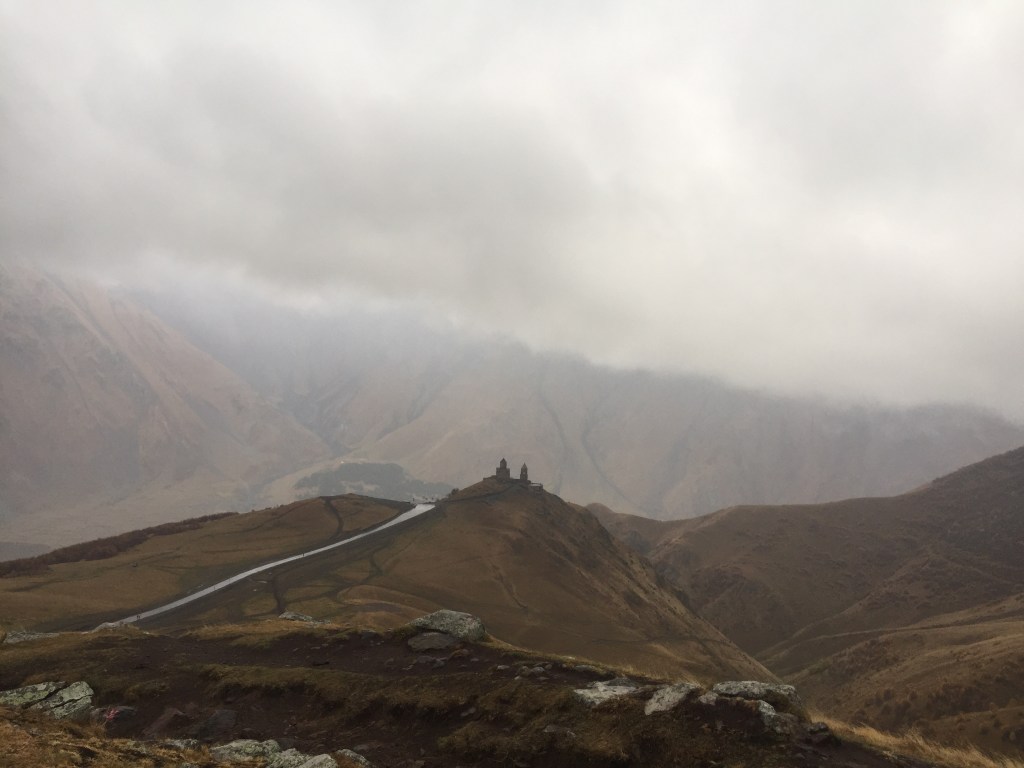 I woke up early, ready to seize the day and do a 12-mile trek to a glacier in rural Georgia. Since most of my trip is in warm climates, I was terribly ill-prepared for the 40 degree rainy weather (plus windchill) in a thin windbreaker and sweater. Nevertheless, I jumped out of bed to meet a group of fellow travelers I found through Couch Surfing. They had proper gear and hiking boots and a solid sense of adventure; I had thin layers and no water (we were meant to stop for snacks and buy water before we left, but ran out of time). We decided to share a taxi to the famous, ancient Gergeti Trinity Church and start our trek to the glacier from there. On the ride up the windy mountain road, I tried to quiet my doubts with every motivational quote I could muster. For every, “what are you doing, you can’t even see any views today,” I cheered myself on with “seize the day! You made it all the way here, push through!” I convinced myself with the “power of YES” and taking advantage of opportunities, and basically was singing “I Hope You Dance” by the time the taxi lurched to a stop in the middle of a cloud atop the mountain. I was feeling dehydrated already, and knew a 12-mile hike with a 3,200 meter gain was not “seizing the day,” but just dumb. I rummaged through the recycling bin at the church for a plastic bottle, rinsed it off, and filled it at the fresh water fountain. My enthusiasm was slightly tempered by the windchill, but I felt ready to grab life by the horns and shake its sweet juices. Instead I was beaten to a pulp, and this is how the world laughs at you, counsels you, molds you. After twenty minutes of shivering, scrambling, and slipping in the mud, I promptly told my fellow adventurers today would not be seized by me, but best of luck! Fog looks the same everywhere, and I didn’t want to risk getting sick.